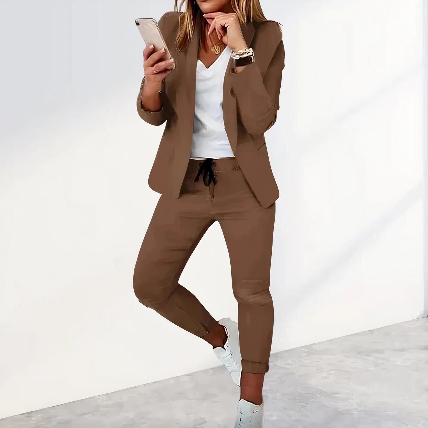 - Koordinierter Stil: Blazer und Hose kreieren ein harmonisches und elegantes Outfit.